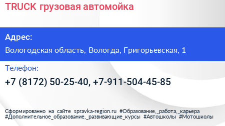 TRUCK, грузовая автомойка по адресу Вологодская область, Вологда, Григорьевская, 1 в дальнейшем Организация, размещена в следующих категориях: