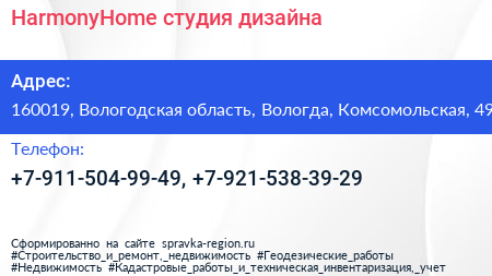 HarmonyHome, студия дизайна по адресу 160019, Вологодская область, Вологда, Комсомольская, 49 в дальнейшем Организация, размещена в следующих категориях: