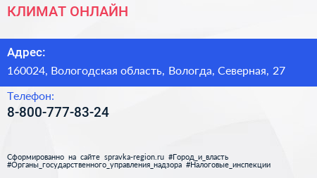 КЛИМАТ ОНЛАЙН по адресу 160024, Вологодская область, Вологда, Северная, 27 в дальнейшем Организация, размещена в следующих категориях: