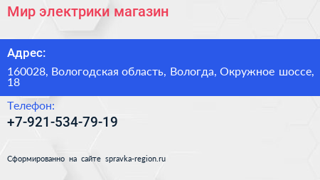 Мир электрики, магазин по адресу 160028, Вологодская область, Вологда, Окружное шоссе, 18 в дальнейшем Организация, размещена в следующих категориях: