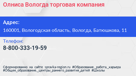 Олниса Вологда, торговая компания по адресу 160001, Вологодская область, Вологда, Батюшкова, 11 в дальнейшем Организация, размещена в следующих категориях: