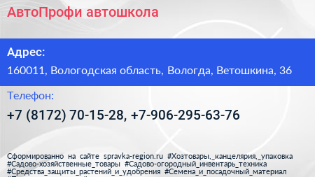 АвтоПрофи, автошкола по адресу 160011, Вологодская область, Вологда, Ветошкина, 36 в дальнейшем Организация, размещена в следующих категориях: