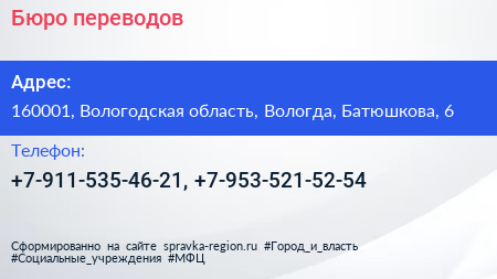 Бюро переводов по адресу 160001, Вологодская область, Вологда, Батюшкова, 6 в дальнейшем Организация, размещена в следующих категориях: