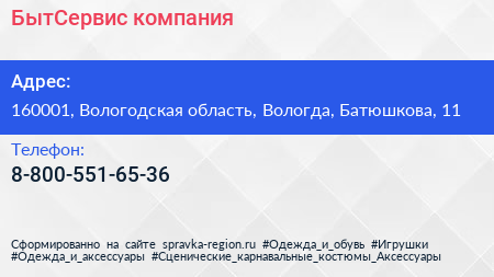 БытСервис, компания по адресу 160001, Вологодская область, Вологда, Батюшкова, 11 в дальнейшем Организация, размещена в следующих категориях: