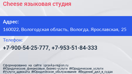 Cheese, языковая студия по адресу 160022, Вологодская область, Вологда, Ярославская, 25 в дальнейшем Организация, размещена в следующих категориях: