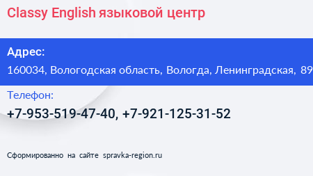 Classy English, языковой центр по адресу 160034, Вологодская область, Вологда, Ленинградская, 89 в дальнейшем Организация, размещена в следующих категориях: