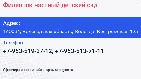 Филиппок, частный детский сад по адресу 160034, Вологодская область, Вологда, Костромская, 12а в дальнейшем Организация, размещена в следующих категориях: