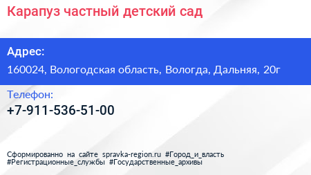 Карапуз, частный детский сад по адресу 160024, Вологодская область, Вологда, Дальняя, 20г в дальнейшем Организация, размещена в следующих категориях:
