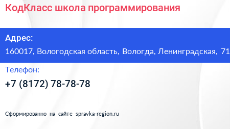 КодКласс, школа программирования по адресу 160017, Вологодская область, Вологда, Ленинградская, 71 в дальнейшем Организация, размещена в следующих категориях: