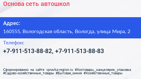Основа, сеть автошкол по адресу 160555, Вологодская область, Вологда, улица Мира, 2 в дальнейшем Организация, размещена в следующих категориях: