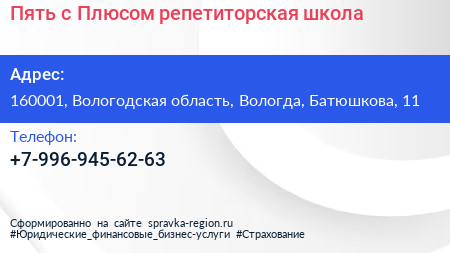 Пять с Плюсом, репетиторская школа по адресу 160001, Вологодская область, Вологда, Батюшкова, 11 в дальнейшем Организация, размещена в следующих категориях: