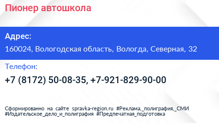 Пионер, автошкола по адресу 160024, Вологодская область, Вологда, Северная, 32 в дальнейшем Организация, размещена в следующих категориях: