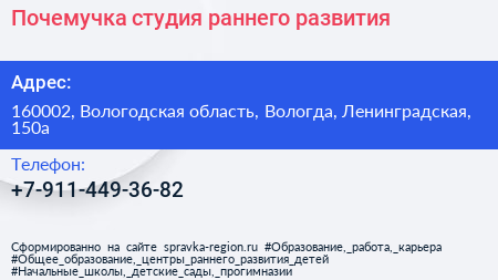 Почемучка, студия раннего развития по адресу 160002, Вологодская область, Вологда, Ленинградская, 150а в дальнейшем Организация, размещена в следующих категориях: