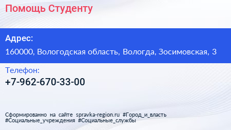 Помощь Студенту по адресу 160000, Вологодская область, Вологда, Зосимовская, 3 в дальнейшем Организация, размещена в следующих категориях: