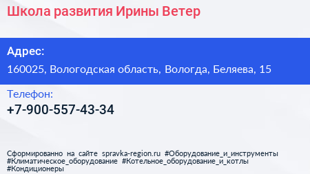 Школа развития Ирины Ветер по адресу 160025, Вологодская область, Вологда, Беляева, 15 в дальнейшем Организация, размещена в следующих категориях: