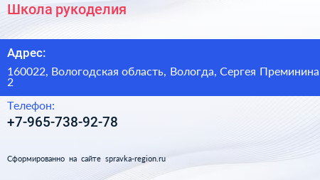 Школа рукоделия по адресу 160022, Вологодская область, Вологда, Сергея Преминина, 2 в дальнейшем Организация, размещена в следующих категориях: