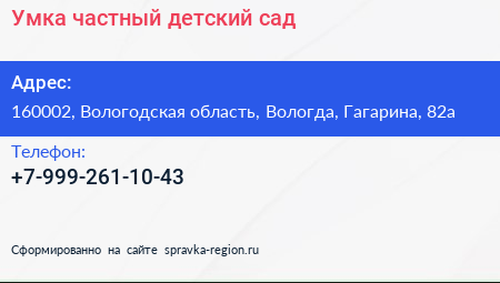 Умка, частный детский сад по адресу 160002, Вологодская область, Вологда, Гагарина, 82а в дальнейшем Организация, размещена в следующих категориях: