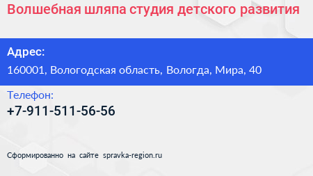 Волшебная шляпа, студия детского развития по адресу 160001, Вологодская область, Вологда, Мира, 40 в дальнейшем Организация, размещена в следующих категориях: