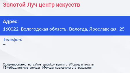 Золотой Луч, центр искусств по адресу 160022, Вологодская область, Вологда, Ярославская, 25 в дальнейшем Организация, размещена в следующих категориях: