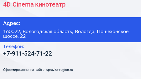 4D Cinema, кинотеатр по адресу 160022, Вологодская область, Вологда, Пошехонское шоссе, 22 в дальнейшем Организация, размещена в следующих категориях: