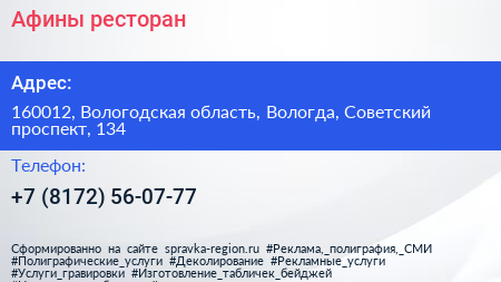 Афины, ресторан по адресу 160012, Вологодская область, Вологда, Советский проспект, 134 в дальнейшем Организация, размещена в следующих категориях: