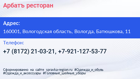 Арбатъ, ресторан по адресу 160001, Вологодская область, Вологда, Батюшкова, 11 в дальнейшем Организация, размещена в следующих категориях: