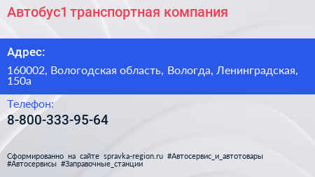 Автобус1, транспортная компания по адресу 160002, Вологодская область, Вологда, Ленинградская, 150а в дальнейшем Организация, размещена в следующих категориях: