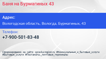 Баня на Бурмагиных, 43 по адресу Вологодская область, Вологда, Бурмагиных, 43 в дальнейшем Организация, размещена в следующих категориях: