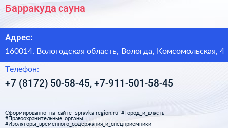 Барракуда, сауна по адресу 160014, Вологодская область, Вологда, Комсомольская, 4 в дальнейшем Организация, размещена в следующих категориях: