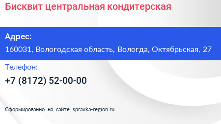 Бисквит, центральная кондитерская по адресу 160031, Вологодская область, Вологда, Октябрьская, 27 в дальнейшем Организация, размещена в следующих категориях: