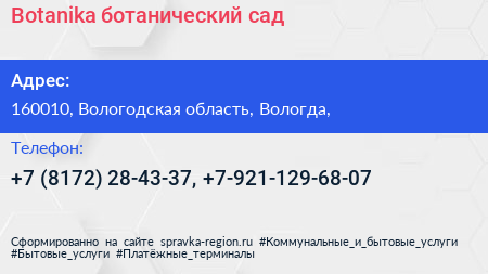 Botanika, ботанический сад по адресу 160010, Вологодская область, Вологда, в дальнейшем Организация, размещена в следующих категориях: