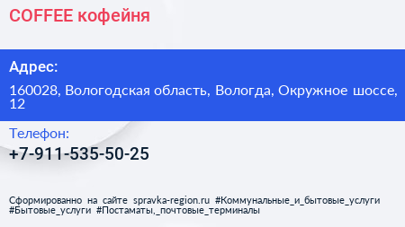 COFFEE, кофейня по адресу 160028, Вологодская область, Вологда, Окружное шоссе, 12 в дальнейшем Организация, размещена в следующих категориях: