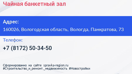 Чайная, банкетный зал по адресу 160026, Вологодская область, Вологда, Панкратова, 73 в дальнейшем Организация, размещена в следующих категориях: