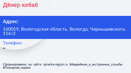 Дёнер кебаб по адресу 160019, Вологодская область, Вологда, Чернышевского, 116/2 в дальнейшем Организация, размещена в следующих категориях: