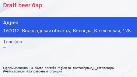 Draft beer, бар по адресу 160012, Вологодская область, Вологда, Козлёнская, 128 в дальнейшем Организация, размещена в следующих категориях: