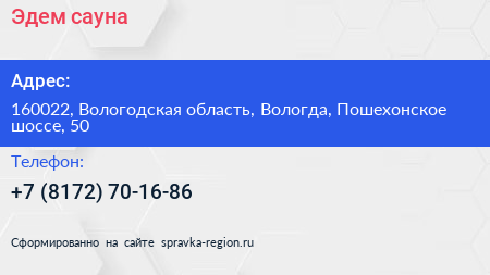 Эдем, сауна по адресу 160022, Вологодская область, Вологда, Пошехонское шоссе, 50 в дальнейшем Организация, размещена в следующих категориях: