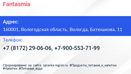 Fantasmia по адресу 160001, Вологодская область, Вологда, Батюшкова, 11 в дальнейшем Организация, размещена в следующих категориях: