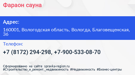 Фараон, сауна по адресу 160001, Вологодская область, Вологда, Благовещенская, 36 в дальнейшем Организация, размещена в следующих категориях: