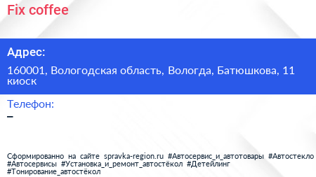 Fix coffee по адресу 160001, Вологодская область, Вологда, Батюшкова, 11 киоск в дальнейшем Организация, размещена в следующих категориях: