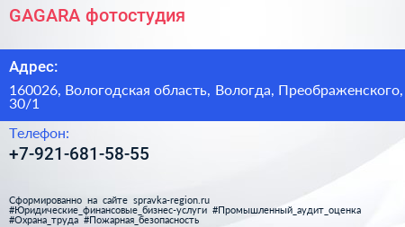 GAGARA, фотостудия по адресу 160026, Вологодская область, Вологда, Преображенского, 30/1 в дальнейшем Организация, размещена в следующих категориях:
