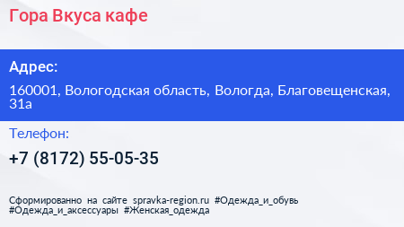 Гора Вкуса, кафе по адресу 160001, Вологодская область, Вологда, Благовещенская, 31а в дальнейшем Организация, размещена в следующих категориях: