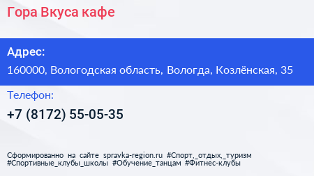 Гора Вкуса, кафе по адресу 160000, Вологодская область, Вологда, Козлёнская, 35 в дальнейшем Организация, размещена в следующих категориях: