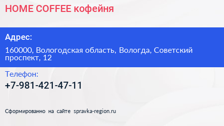 HOME COFFEE, кофейня по адресу 160000, Вологодская область, Вологда, Советский проспект, 12 в дальнейшем Организация, размещена в следующих категориях: