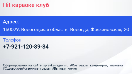 Hit, караоке-клуб по адресу 160029, Вологодская область, Вологда, Фрязиновская, 20 в дальнейшем Организация, размещена в следующих категориях: