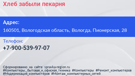 Хлеб забыли, пекарня по адресу 160501, Вологодская область, Вологда, Пионерская, 28 в дальнейшем Организация, размещена в следующих категориях:
