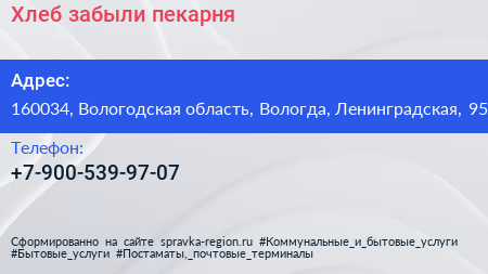 Хлеб забыли, пекарня по адресу 160034, Вологодская область, Вологда, Ленинградская, 95 в дальнейшем Организация, размещена в следующих категориях: