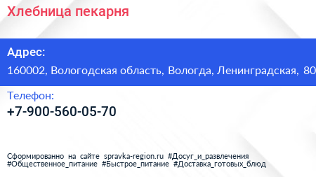 Хлебница, пекарня по адресу 160002, Вологодская область, Вологда, Ленинградская, 80 в дальнейшем Организация, размещена в следующих категориях: