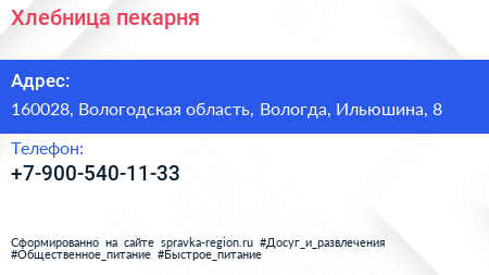 Хлебница, пекарня по адресу 160028, Вологодская область, Вологда, Ильюшина, 8 в дальнейшем Организация, размещена в следующих категориях:
