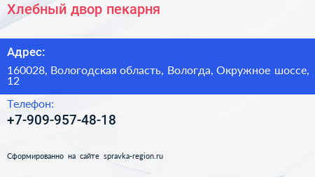Хлебный двор, пекарня по адресу 160028, Вологодская область, Вологда, Окружное шоссе, 12 в дальнейшем Организация, размещена в следующих категориях:
