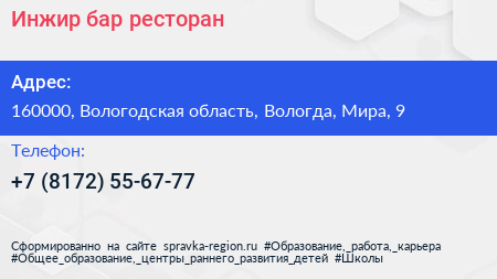 Инжир, бар-ресторан по адресу 160000, Вологодская область, Вологда, Мира, 9 в дальнейшем Организация, размещена в следующих категориях: